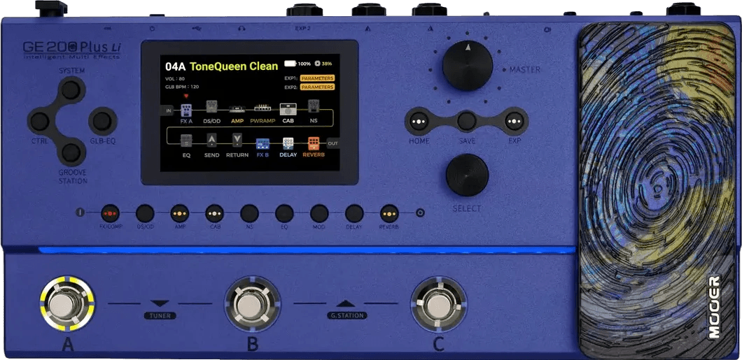 The MOOER GE200 Plus Li is a multi-effects pedal and amp modeler designed for comprehensive effects processing and signal routing. This effects processor offers over 270 effect models, 255 user presets, and 40 MNRS slots dedicated to amp and cabinet simulation. It is compatible with third-party impulse responses (IRs) up to 2048 points, enabling flexible tone shaping. Connectivity includes USB MIDI, Bluetooth 5.0 audio playback, stereo 1/4" and XLR outputs, a headphone output, and an external expression pedal input. Additional built-in functions include a drum machine with 70 rhythm and metronome patterns, a 60-second phrase looper, and low-latency ASIO USB audio interface. The device is available in a standard white version or as a blue, battery-powered Li edition with customizable ambient LED lighting.