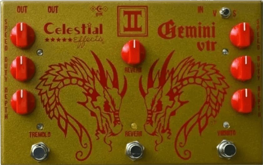 The Celestial Effects Gemini VTR pedal delivers three independent effects—vibrato, tremolo, and reverb—within a single enclosure. Designed with true bypass switching, this multi-effects pedal allows for seamless signal integrity when the effect is not engaged. All controls for vibrato, tremolo, and reverb are accessible from the front panel, making it possible to dial in each effect independently or stack them in various combinations. The Gemini VTR uses high-quality components to maintain durability and consistent performance.