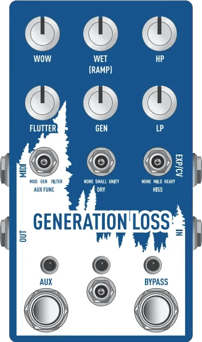 The Cooper Fx Generation Loss is a stereo lo-fi modulation effects pedal designed to emulate the sonic character of vintage and degraded tape media. Using a combination of pitch modulation, filtering, sample rate reduction, and noise introduction, this effects pedal recreates the artifacts commonly associated with repeated tape dubbing and magnetic media wear. Controls allow precise manipulation of signal bandwidth, noise level, and modulation depth, providing a wide palette of nostalgic audio textures. The Generation Loss pedal features true bypass operation for signal integrity when bypassed.