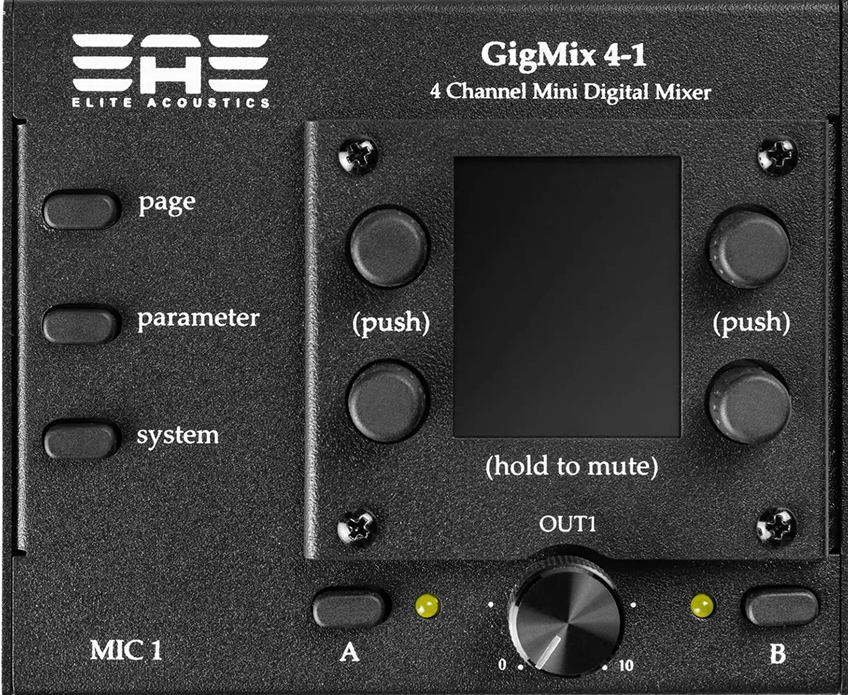 The Elite Acoustics GigMix 4-1 mini digital mixer is a compact 4-channel audio mixer designed for effects pedals, live sound setups, and instrument processing. Powered by a 32-bit 100MHz DSP engine, this portable unit features a color display for easy navigation and control. Each of the four channels includes dedicated level control for reverb and shimmer effects, with assignable delay, compressor, limiter, mid sweepable EQ, highpass filter, notch filter, and phase reverse options for tailored sound shaping.