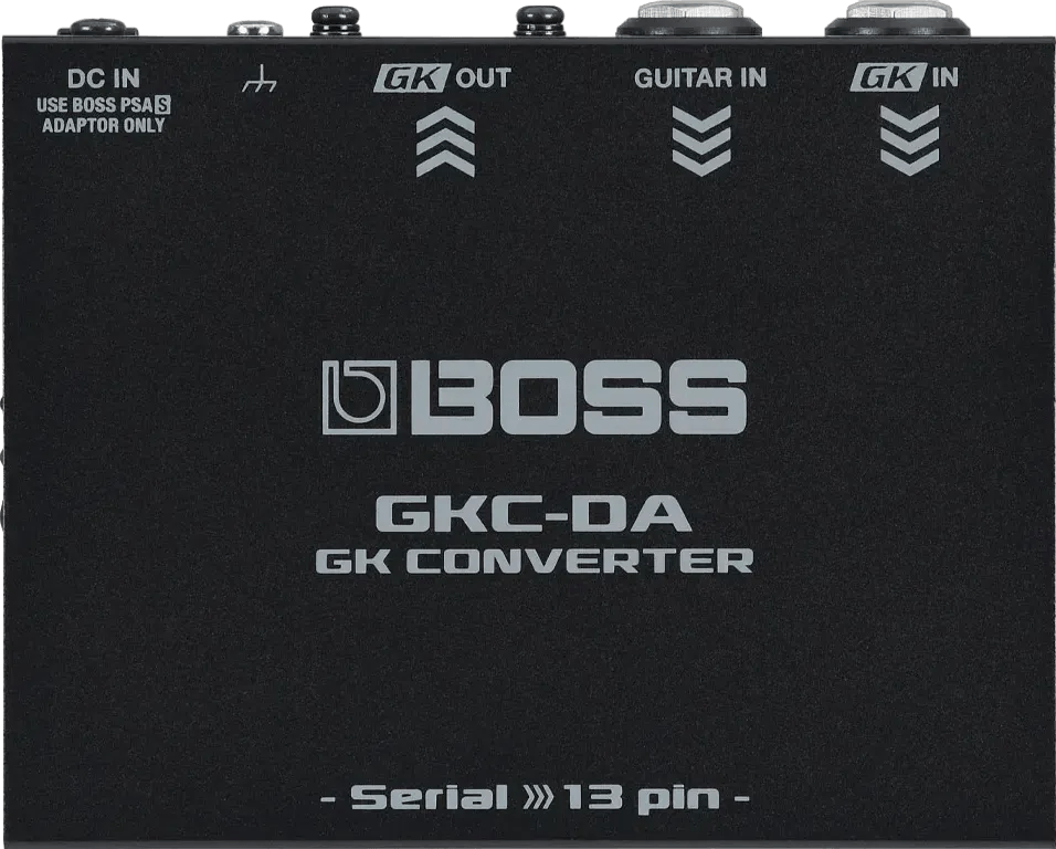 The BOSS GKC-DA is a GK Converter designed to enable connectivity between devices equipped with the Serial GK digital interface and those utilizing the traditional 13-pin GK analog interface. This converter allows users to drive 13-pin GK effects pedals, guitar synthesizers, and modeling units—including the BOSS SY-1000 and GP-10—via the Serial GK output found on GK-5, GK-5B Divided Pickups, or the GM-800 Guitar Synthesizer. The GKC-DA provides seamless integration between new BOSS guitar synth gear and legacy 13-pin GK-compatible devices.