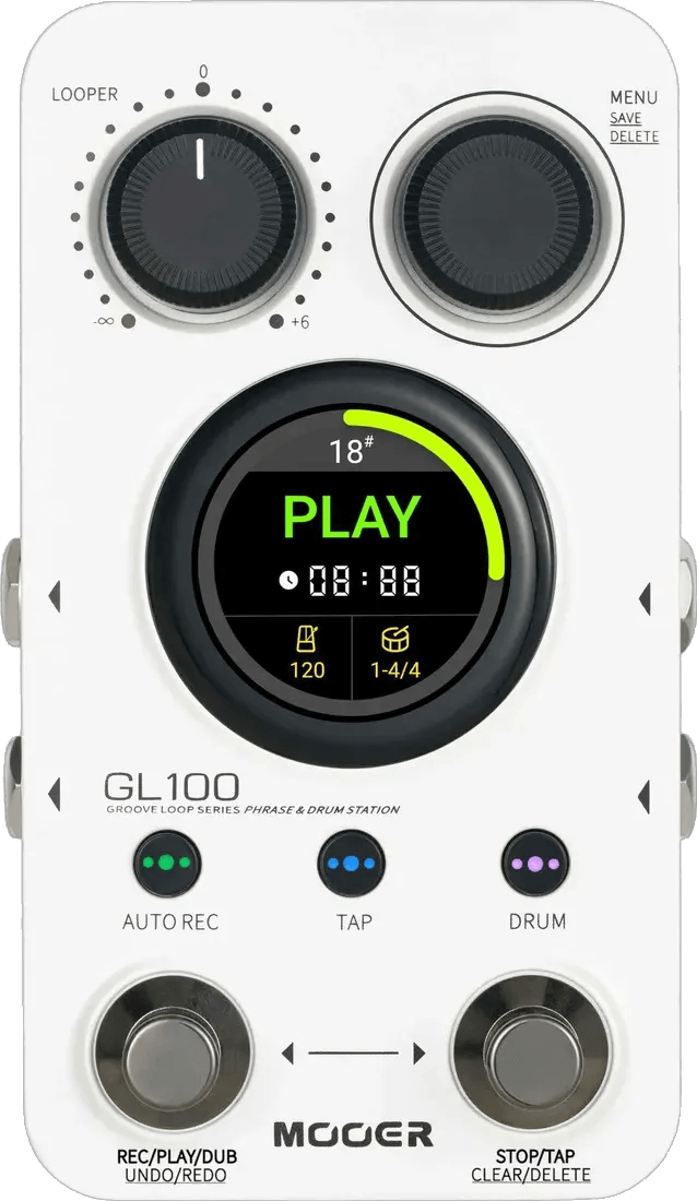 The MOOER GL100 Phrase Drum Station is a loop station pedal with integrated drum machine, designed for phrase looping, live performance, and recording. This MOOER effects pedal features up to 300 minutes of loop time across 100 memory slots, controllable via dual footswitches and a 1.3-inch touchscreen interface. The built-in drum machine offers 11 accompaniment styles with auto-accompaniment, time-stretch, and quantization for accurate loop timing. The GL100 supports mono and stereo operation, includes tap tempo functionality, and provides flexible audio routing options. USB connectivity enables easy recording management and firmware updates via compatible computer software.