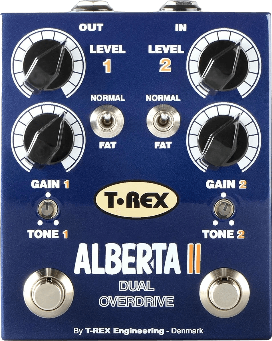 The T-Rex Alberta II is a dual overdrive effects pedal offering two independently controllable channels for dynamic signal processing. Each channel features its own drive, level, and tone controls, allowing distinct settings for rhythm and lead overdrive. The stacked circuit design lets users toggle seamlessly between moderate overdrive layers or use in tandem for more saturated tones. Designed for flexible pedalboard integration, the T-Rex Alberta II includes true bypass switching, ensuring signal integrity when the pedal is not engaged.