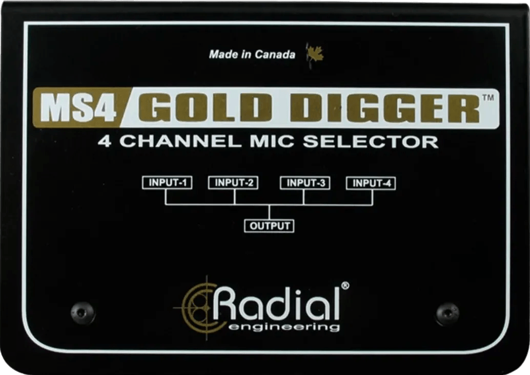 The Radial Engineering Gold Digger is a 4-input, 1-output microphone selector designed to streamline studio workflow by enabling rapid comparison of up to four microphones through a single microphone preamp. This passive microphone switcher maintains the original sound character of each microphone and avoids signal coloration or degradation. With dedicated select switches for each channel and gold-contact signal relays, the Gold Digger allows for instantaneous A/B/C/D mic evaluation without the need to unplug cables or interrupt a recording session.