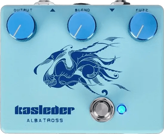 The Kasleder Albatros is a hybrid fuzz and preamp pedal designed to combine modern JFET preamp circuitry with classic transistor fuzz tones. This analog fuzz stompbox offers a wide range of tonal shaping options, allowing for both subtle signal boost and saturated fuzz effects. True bypass switching preserves signal integrity when the pedal is not engaged. The Albatros is constructed with discrete components and features standard 1/4" input and output jacks for compatibility with various music gear setups.