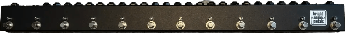 The Bright Onion Pedals 12 Strip Looper is a 12-loop true bypass switcher pedal designed for managing large effects pedalboards. Each loop can be individually engaged or bypassed, allowing for organized routing and signal path switching. This looper strip uses mechanical switches to maintain full signal integrity when in bypass mode. Connectivity includes send and return jacks for all 12 loops, as well as input and output connections to integrate with your pedal chain or amplifier system. Compact and road-ready, the Bright Onion Pedals 12 Strip Looper is engineered for efficient, noise-free switching on demanding pedalboard setups.