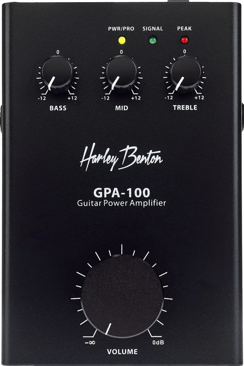 The Harley Benton GPA-100 is a compact Class D power amplifier pedal designed for powering speaker cabinets. Delivering 100 Watts at 8 Ohms and 190 Watts at 4 Ohms, this effects pedal amplifier features a three-band EQ for adjusting bass, mid, and treble frequencies. Front-panel Signal and Peak LEDs provide real-time monitoring of your input levels. The GPA-100 supports bass instrument compatibility and is designed for direct connection to speaker cabinets, making it suitable for use as a main power amp or a reliable backup.