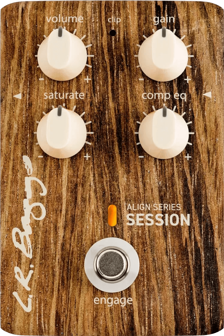 The LR Baggs Align Series Session is an acoustic preamp effects pedal designed to enhance the tonal quality of acoustic instrument pickups using dedicated studio-inspired circuitry. This pedal leverages a three-band Comp EQ section, with independent low, mid, and high frequency compressors, to address problematic frequencies and provide dynamic tone shaping. Each band responds in real time, applying more compression in relation to playing intensity for natural acoustic dynamics.