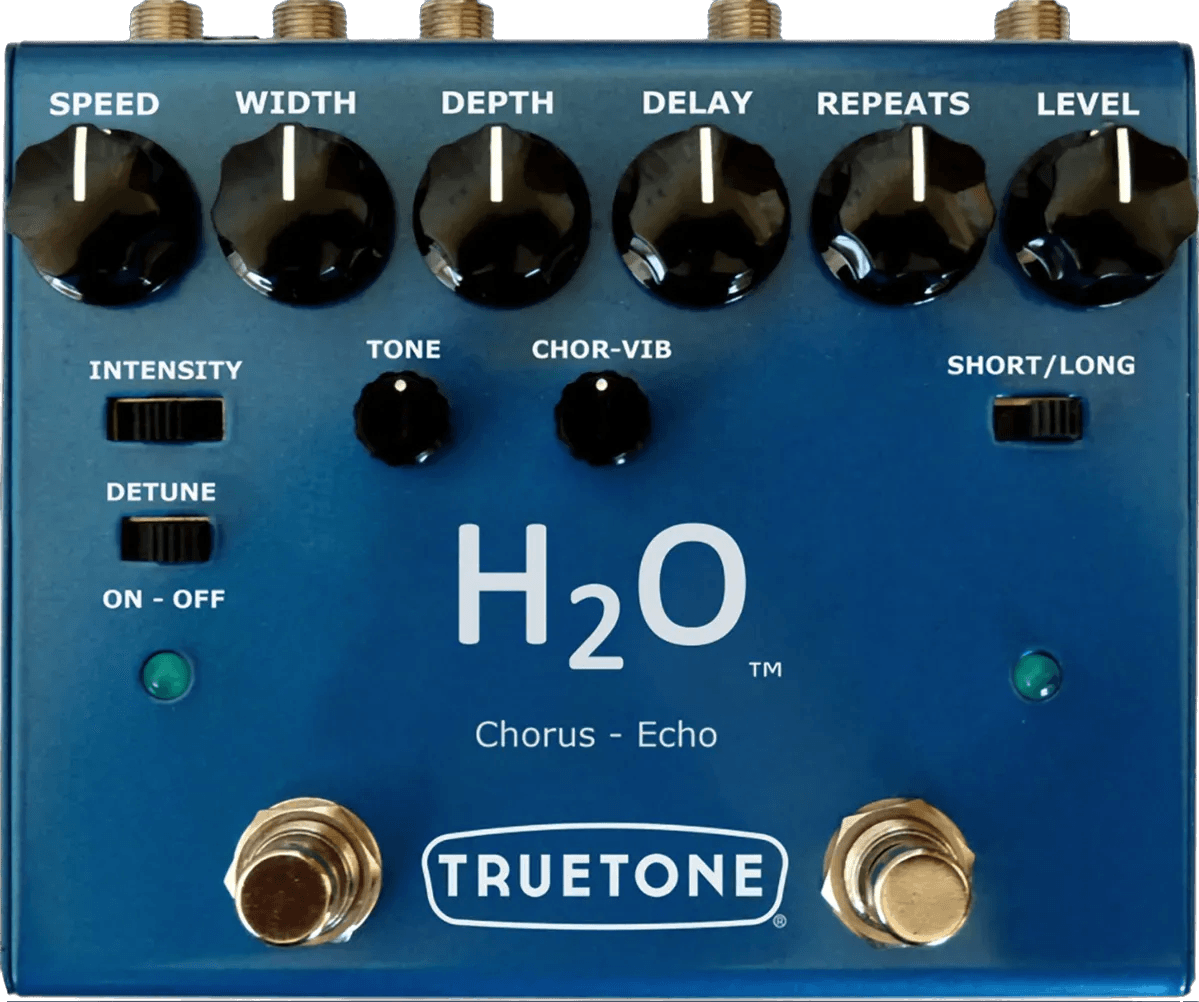 The Truetone H2O v3 is a dual analog chorus and echo effects pedal designed for a wide range of modulation and delay applications. This analog chorus pedal and analog delay pedal combination features independent controls for each effect, allowing separate or simultaneous use. The unit offers controls for delay time, repeat, and effect level for the echo section, while the chorus section provides width, speed, and depth parameters. The H2O v3 effects pedal is equipped with true bypass switching for signal clarity and maintains robust build quality for pedalboard integration. It offers mono input and output and is fully compatible with bass instruments.