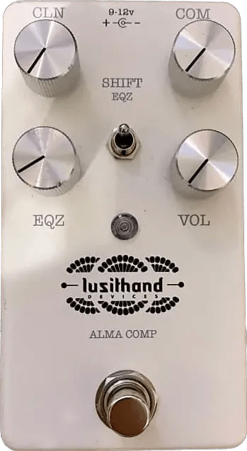 The Lusithand Alma Comp MKII is a compressor effects pedal designed for shaping dynamics with precise control. This updated version includes an internal voltage doubler for increased headroom and a Clean blend knob to mix the dry and compressed signals. New to the MKII model are a selectable Ratio switch, offering 2:1, 4:1, and 8:1 compression ratios, and a gain reduction meter for visual feedback on the amount of compression applied to the input. The pedal maintains core features of the original design while adding enhanced control and monitoring options for dynamic signal processing.