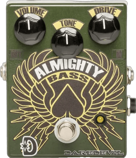 The Daredevil Pedals Almighty Bass is a bass fuzz effects pedal built around an original circuit. Designed specifically for bass instruments, this fuzz pedal delivers high gain and full, clear low end without the frequency loss common in some other bass effects. The Almighty Bass provides a wide tonal range, offering substantial volume and sustain suitable for blending with a direct-injection (DI) signal or amplifier gain.