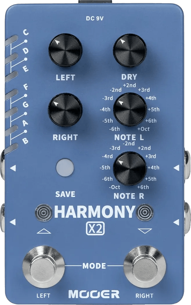 The MOOER Harmony X2 is a dual channel harmony effects pedal designed for creating complex harmonic layers and independent stereo processing. It allows users to select any of the 12 chromatic pitches as a root note and supports both major and minor scales. The pedal offers 11 selectable harmony modes, providing access to intervals such as thirds, fifths, sevenths, and octaves. Independent left and right stereo outputs enable assignment of different harmonic intervals and separate volume control for each channel, enhancing possibilities for stereo sound design. The Harmony X2 effects pedal supports dual harmonies for advanced harmonic shifting and stereo output configurations.