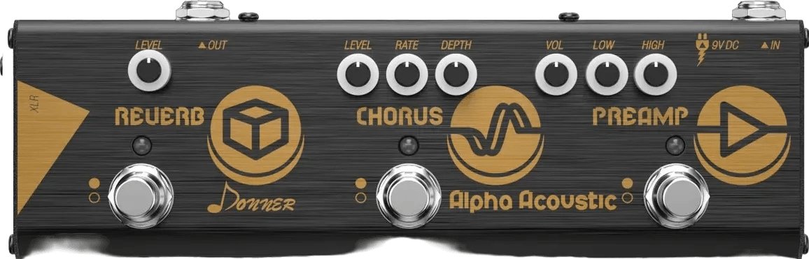 The Donner Alpha Acoustic mini is a multi-effects pedal that combines acoustic preamp, chorus, and hall reverb effects into a single unit. It offers a dedicated preamp module for tonal control, a chorus module to add modulation and spaciousness, and a hall reverb effect for natural decay and depth. The pedal features an LED status indicator and employs buffer bypass circuitry to maintain signal clarity. Its compact design provides a space-saving solution for acoustic effect processing on pedalboards.
