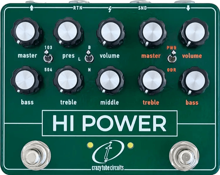 The Crazy Tube Circuits Hi Power is an amp-in-a-box overdrive effects pedal designed to capture the sound and response of two classic British amplifiers. This overdrive pedal provides tonal characteristics reminiscent of the iconic tones found on the Pink Floyd “Wish You Were Here” album, combining dynamic touch sensitivity with harmonically rich breakup. Core controls allow users to shape gain, tone, and output levels for precise sound sculpting. The Hi Power pedal features true bypass switching to maintain signal integrity when bypassed.