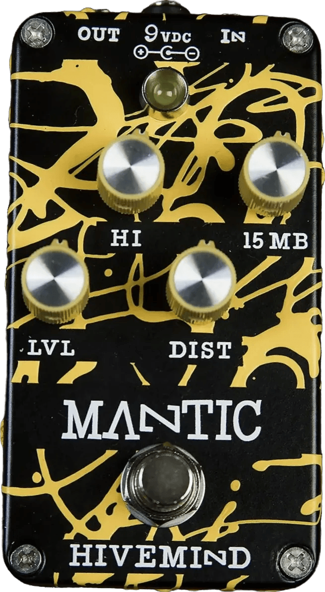 The Mantic Effects Hivemind is a fuzz effects pedal replicating the classic FX33 Buzz Box circuit. This pedal combines a two-octave-down square wave generator with a high-intensity distortion stage. A variable low-pass filter (LPF) enables users to shape the output tone. The Hivemind maintains the circuit’s characteristic gated, aggressive texture.