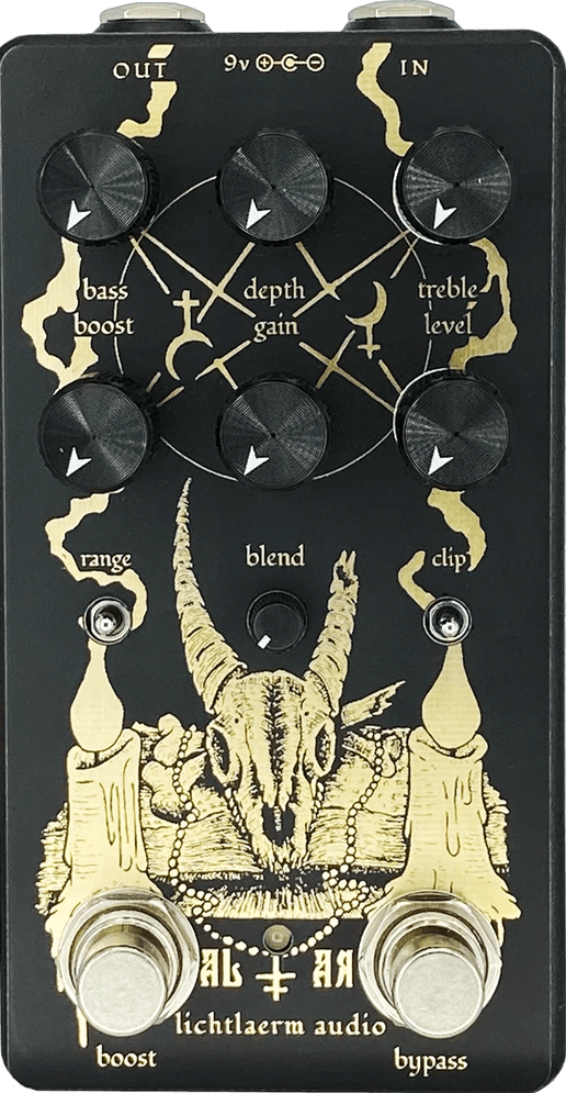 The Lichtlaerm Audio Altar MKIII is a dual effects pedal combining a high-output clean boost with a high-gain fuzz/distortion circuit. Inspired by the sonic character of the Black Russian Big Muff, this fuzz pedal delivers substantial low end, enhanced sustain, and aggressive punch. Independent circuits allow users to blend clean boost and fuzz/distortion for flexible sound shaping.