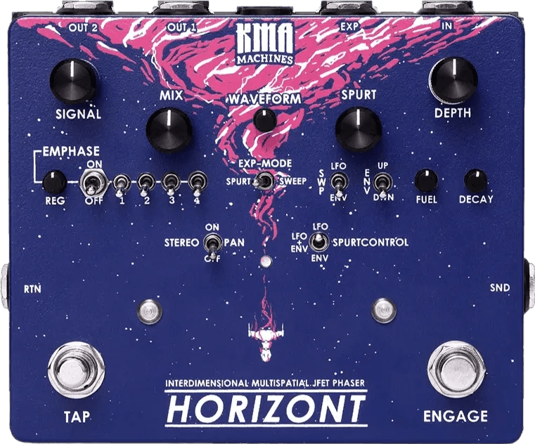 The KMA Machines Horizont is a stereo analog phaser pedal that blends traditional JFET phasing with innovative, digitally controlled modulation features. Designed for musicians seeking advanced phase modulation options, this KMA effects pedal incorporates both classic warm phasing and dynamic, modern controls. The Horizont offers stereo output and extensive parameter tweaking, making it suitable for creating vivid modulation textures. Key controls include depth, rate, mix, resonance, and center, alongside waveform selection and envelope sensitivity adjustment. Connectivity includes expression pedal input and CV input for real-time modulation. Bass compatibility is not specified.