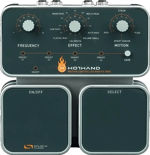 The Source Audio Hot Hand Wah Filters is a dedicated motion-controlled wah effects pedal featuring eleven filter types, including classic wah, multiple low pass and band pass filters, multi-peak options, auto-wah, and volume swell modes. This pedal utilizes a wireless sensor ring, allowing direct modulation of effects via hand movement. Four memory locations are available for storing presets. The Hot Hand system enables control over up to three compatible devices simultaneously, with adjustable motion sensitivity for precise response. Connectivity includes an expression pedal input, expression output for integrating with other effect boxes or keyboards, and a sensor output to connect additional Hot Hand devices. The unit features active analog bypass, a 24-bit A/D-D/A converter, and 56-bit processing for high-resolution audio. The signal range supports use with bass instruments and keyboards.