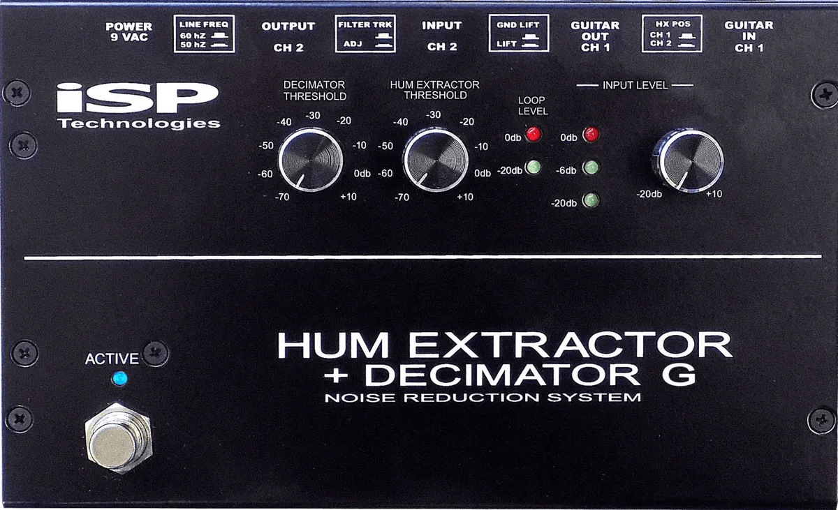 The ISP Technologies Hum Extractor + Decimator G is a dual-channel noise reduction effects pedal designed to address power line frequency hum and signal noise in music gear. The Hum Extractor™ circuit targets and removes unwanted 50Hz or 60Hz hum caused by magnetic field interference, while the Decimator G section offers advanced noise reduction for signal chain clarity. This pedal is engineered to maintain audio fidelity while eliminating unwanted noise from transformer hum and signal interference.
