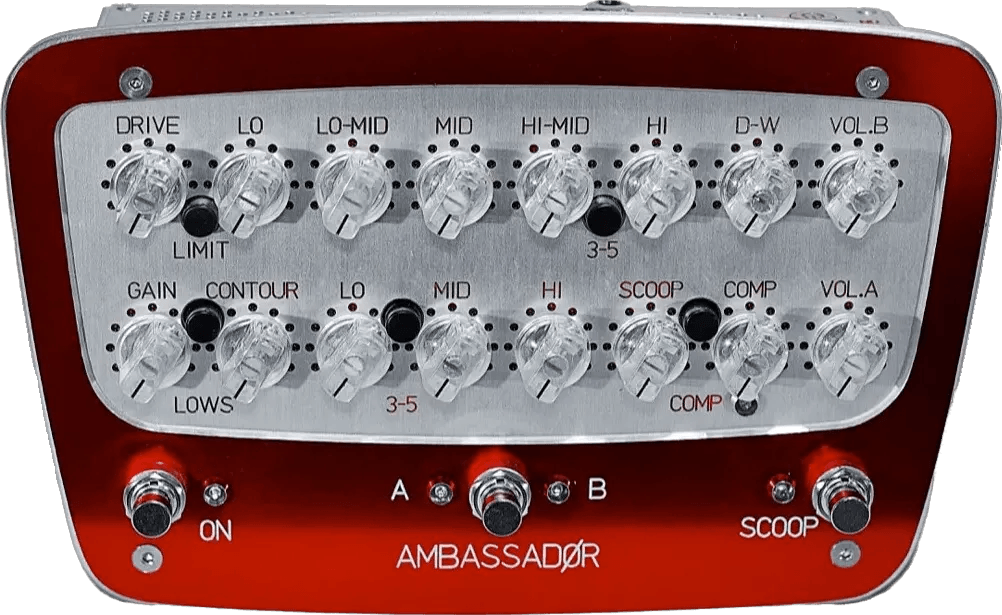 The Redstuff Amplification Ambassador Two Channel is a bass preamp pedal designed for pedalboards, utilizing subminiature tube technology. This unit provides two independent channels, offering a range of tones from clean preamp sounds to higher-gain overdrive. The Ambassador includes a built-in 2-watt headphone amplifier, allowing for direct monitoring or the ability to drive small speaker cabinets for low-volume practice. Designed specifically for bass compatibility, this preamp pedal prioritizes signal integrity and tonal flexibility for bass instruments.