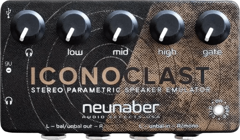 The Neunaber Iconoclast Speaker Emulator provides adjustable speaker and cabinet emulation for effects pedalboards, studio, and live setups. Unlike traditional static impulse response (IR) loaders, this Neunaber effects pedal utilizes proprietary digital filters for real-time sound shaping. Users can fine-tune the response with dedicated controls, enabling flexible EQ and resonance adjustments for tailored speaker simulation. Connectivity includes stereo output for use in dual-amp or recording systems. The Iconoclast is designed for low-latency performance and integrates easily into pedalboard signal chains.