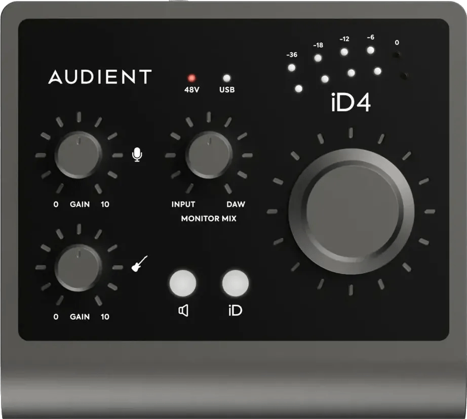 The Audient iD4 (MKII) is a USB audio interface designed for high-quality home recording and music production. This compact desktop interface features a single Audient Console mic preamp, a dedicated JFET instrument input, and 24-bit/96kHz audio resolution. Connectivity includes dual headphone outputs and a main monitor output, supporting studio monitoring and direct recording setups. The iD4 (MKII) also includes a large volume knob for precise level control and a USB-C connection for fast, reliable data transfer and power.