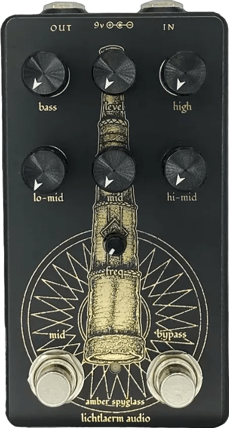 The Lichtlaerm Audio Amber Spyglass is a 4-band EQ and boost effects pedal that provides a flexible approach to tone shaping. Designed with constant-Q, non-interactive filters, it offers independent control over bass, low-mids, high-mids, and treble frequencies to adjust the signal either before or after gain stages. The semi-parametric mid control allows precise manipulation of the midrange, supporting up to +16dB of full-range boost. The pedal features high headroom and a low noise floor, allowing for clean, dynamic frequency adjustments.