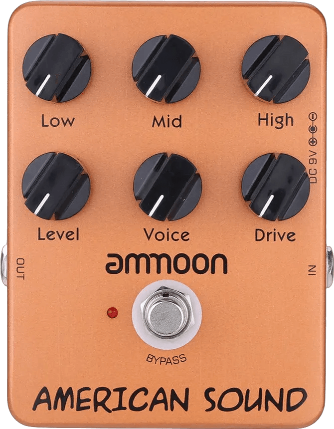 The Ammoon American Sound is an amp simulator effects pedal designed to emulate the tonal characteristics of a Fender 57' Deluxe amplifier. Featuring a streamlined control layout, this amp simulation stompbox allows detailed adjustment of drive, level, low, mid, high, and voice parameters, enabling precise sound shaping. The output is mono, and the pedal uses standard 1/4" instrument connections. True bypass switching ensures signal clarity when the effect is disengaged.
