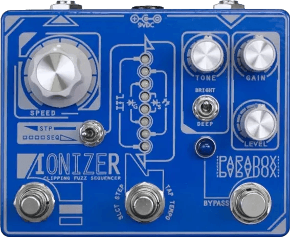 The Paradox Effects Ionizer is a fuzz stompbox with integrated step sequencing and multiple clipping options. This analog clipping fuzz sequencer features four selectable diode voices—Silicon, Germanium, LED, and Mosfet—each providing distinct tonal characteristics. The Ionizer’s sequencer can be advanced automatically at user-defined rates, with tempo controlled either by the onboard Speed knob or via tap tempo functionality.