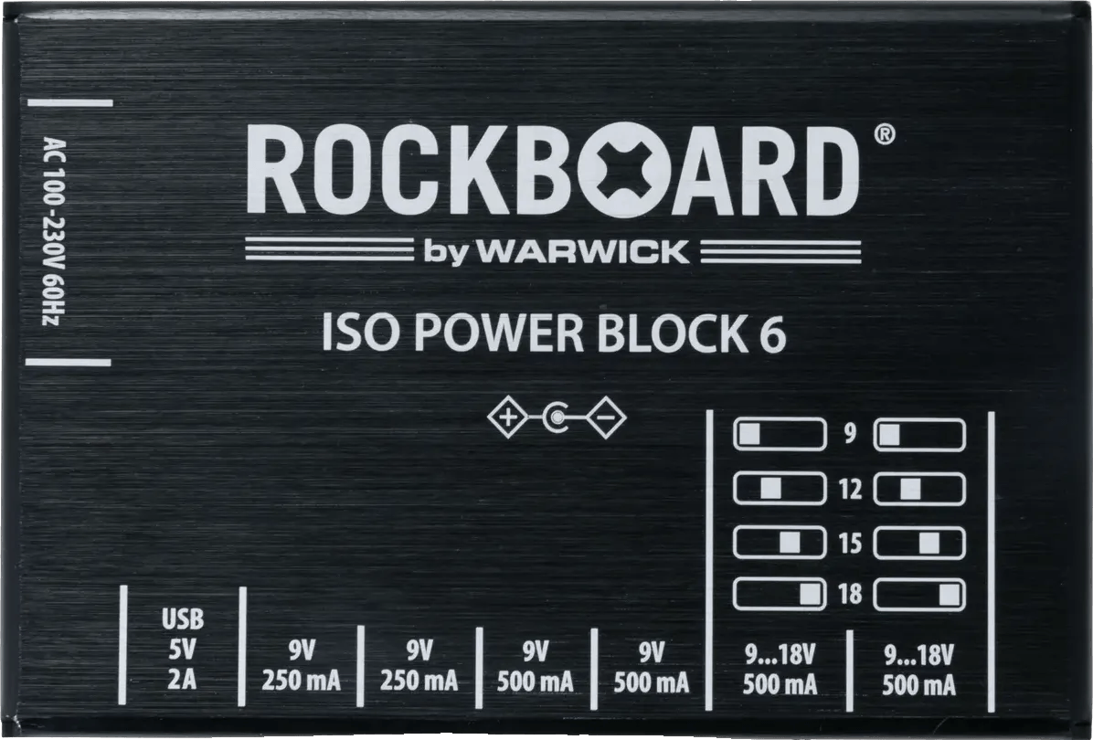 The RockBoard ISO Power Block V6 IEC is a multi-output isolated power supply designed for powering up to six effects pedals simultaneously. Each output features a dedicated transformer and advanced DC filtering to minimize high-frequency noise and ensure silent operation. This power supply provides six individually isolated and short-circuit protected power outputs, along with a 5V USB port for powering compatible devices. Each output has its own LED status indicator, allowing for immediate identification of any slot issues without affecting other connected pedals.