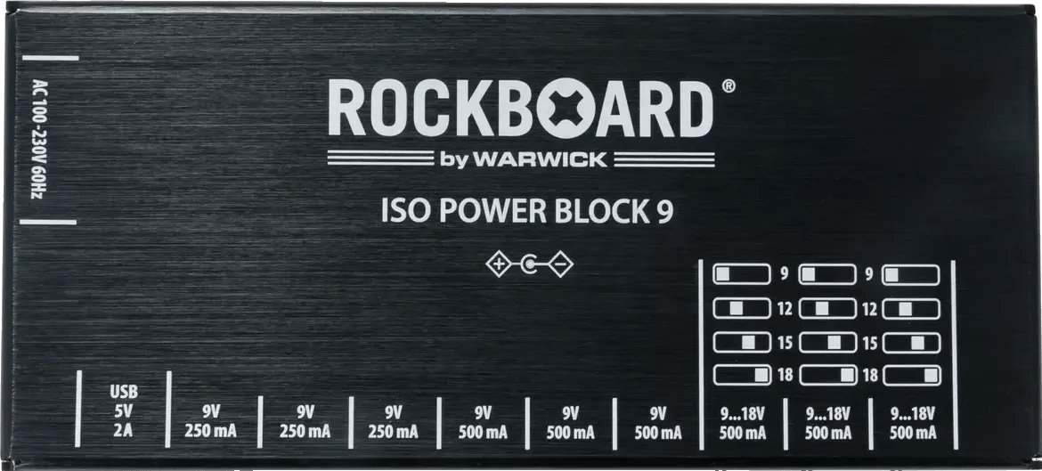 The RockBoard ISO Power Block V9 IEC is a multi-output isolated power supply designed for use with a range of effects pedals. Equipped with nine transformer-isolated and individually filtered DC power slots, this pedal power source delivers quiet, consistent operation for up to nine effects pedals simultaneously. Each output features short circuit protection, while dedicated LEDs clearly indicate active status for each power slot. A 5V USB output is included for powering compatible devices. The advanced noise-filtering circuitry minimizes high-frequency interference, supporting a reliable pedalboard setup.