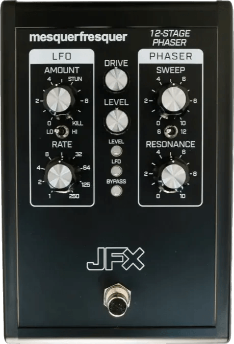 The Jordan Fresque Effects JF-103 "mesquerfresquer" is an analog 12-stage phaser pedal designed for deep signal modulation. This phaser offers a wide range of effects, from subtle coloration to intense phase sweep and ring modulation-style textures. The unit features multiple CV input and output connections, as well as dedicated expression pedal inputs, enabling extensive real-time parameter control and integration into modular synth or analog effects setups. Modular connectivity allows for simultaneous manipulation of several parameters and compatibility with other CV-equipped analog effects units.
