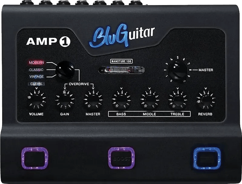 The BluGuitar AMP1 Iridium Edition is a high-gain amplifier pedal designed to deliver tube-driven tones and 100 watts of output in a compact, pedalboard-friendly format. Developed in collaboration with international metal musicians, this BluGuitar effects pedal features a tube preamp section combined with Class D power amplification, offering a tight and focused response tailored for modern metal styles. The unit is equipped with multiple channels, intuitive controls for gain, tone shaping, and master volume, as well as connectivity for speaker cabinets, effects loops, and remote control switching.