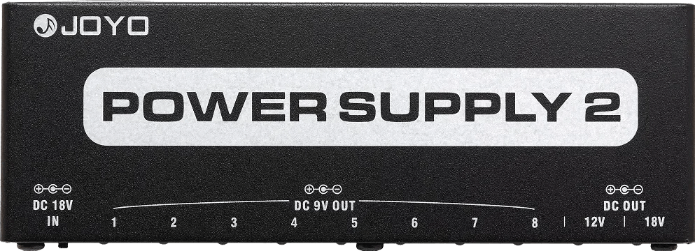 The JOYO JP-02 Power Supply 2 is a pedalboard power supply designed to provide isolated and filtered DC power for up to 10 effects pedals simultaneously. Each output supplies 9V DC at 100mA, with two dedicated outputs rated at 500mA for higher-current pedals. This multi-output power supply features built-in short circuit protection and individually isolated outputs, reducing noise and minimizing signal interference across connected pedals. The compact unit includes power cables and a mains adapter for streamlined integration into pedalboard setups.