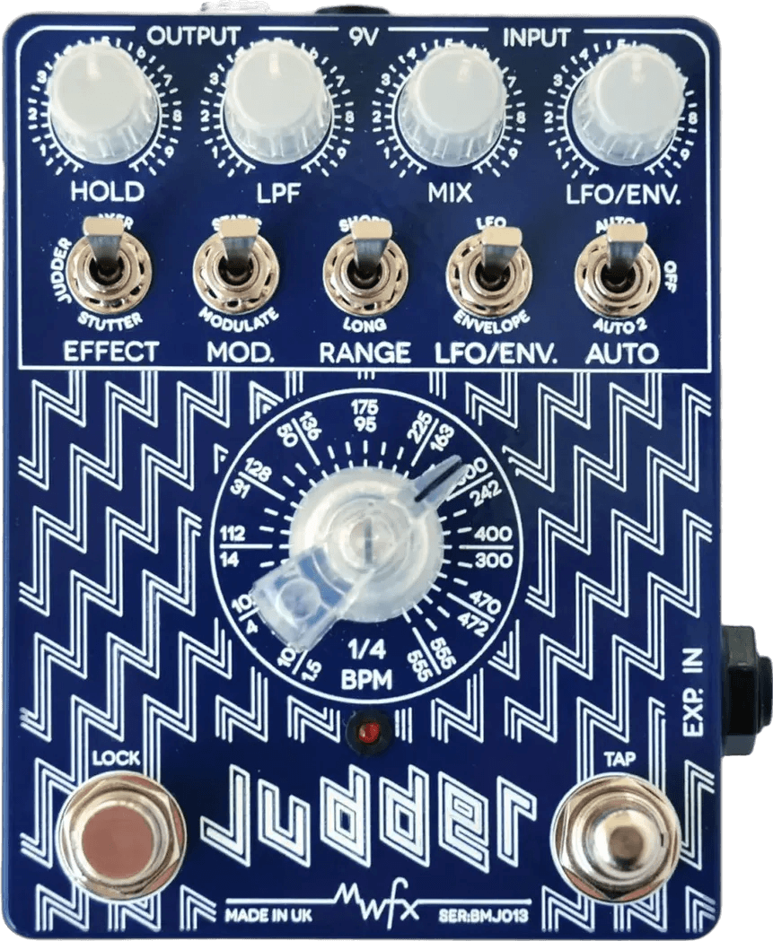 The MWFX Judder is a mid-fi looper effects pedal designed for real-time audio manipulation, switching smoothly between recording and playback to generate choppy, renewable loops. Analog switches and control knobs modulate standard signals, producing a range of lo-fi sounds with glitch, stutter, and modulation effects.