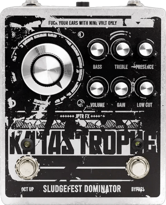 The Jptr Fx Katastrophe is a high-gain analog distortion pedal designed to deliver articulate drive tones with extensive tonal shaping options. This dirt effects pedal operates as either a standard distortion or as a full preamp, offering flexible placement in signal chains. Core controls include independent Volume, Gain, Bass, Treble, and Presence knobs, with an externally accessible low cut switch to remove low-frequency content for modern, high-gain textures. The analog Octave Up section, accessed via a dedicated footswitch, provides additional gain and harmonics, based on the circuit from the Silvermachine pedal. Internal switches allow adjustment of high frequencies, while dedicated internal boosts for low end and dry signal run in parallel, supporting bass compatibility. A post-gain trim pot optimizes performance for various pickup outputs.