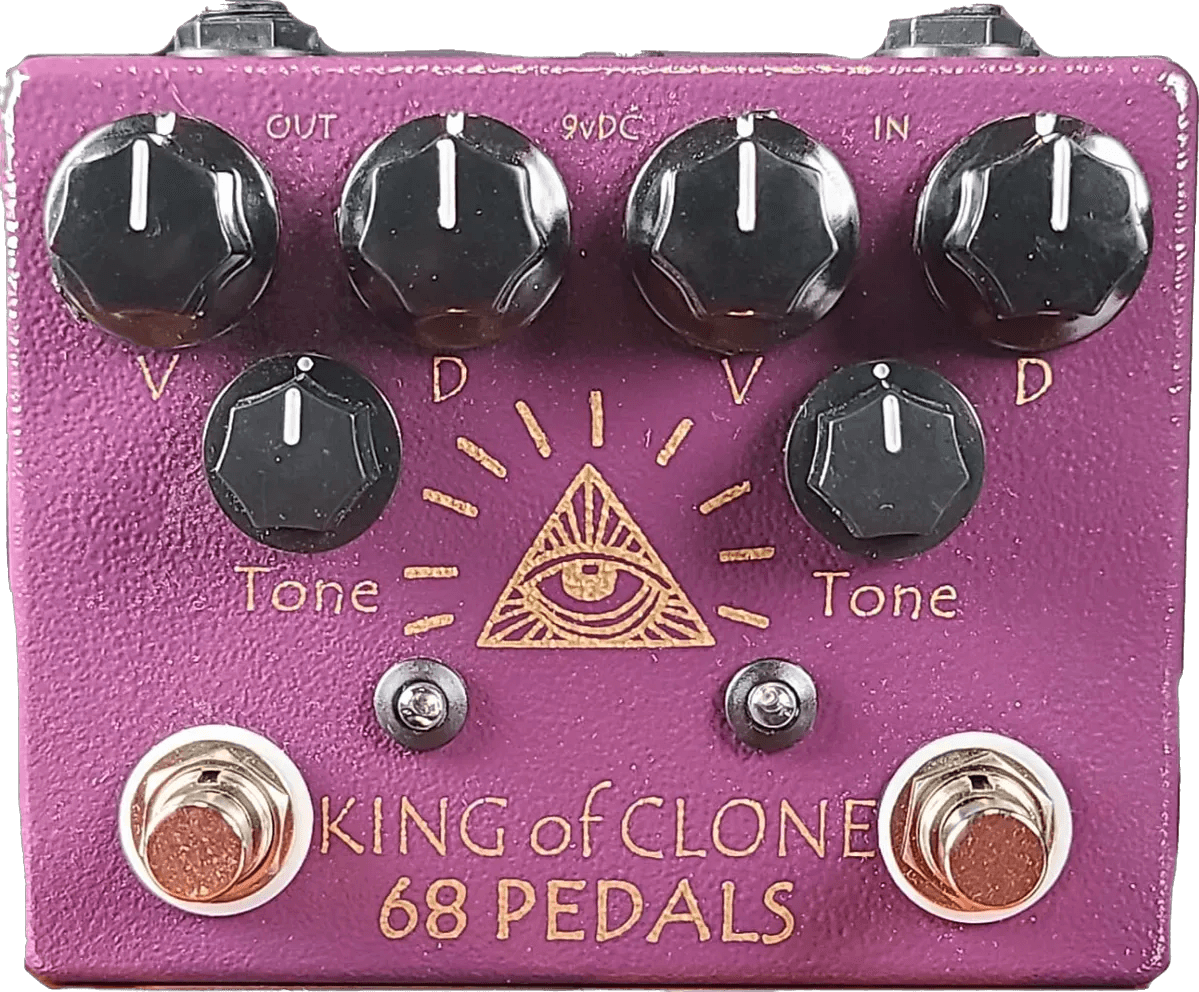 The 68 Pedals King Of Clone is an overdrive effects pedal designed as a precise recreation of the renowned Analogman King of Tone. This dual-channel stompbox uses true bypass switching and provides two independent circuits for overdrive tones. Each side features controls for drive, tone, and volume, enabling flexible gain staging and tonal control. The King Of Clone includes internal dip switches for further voicing customization and operates via standard 9V DC power.