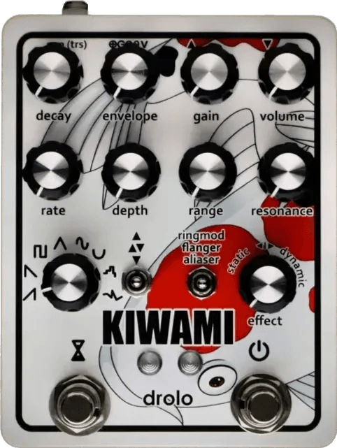 The Drolo Kiwami is a dual bandpass filter effects pedal designed for deep modulation and sound design. It features two resonant bandpass filters that sweep in opposite directions, which can be activated individually or together. Filter modulation options include an onboard LFO, envelope follower, manual control, or a blend of these sources. A dedicated gain stage before the filters provides the option to introduce significant distortion. The pedal also integrates additional effects—a ring modulator, flanger, and aliaser—usable in conjunction with the filters for expanded sonic possibilities.