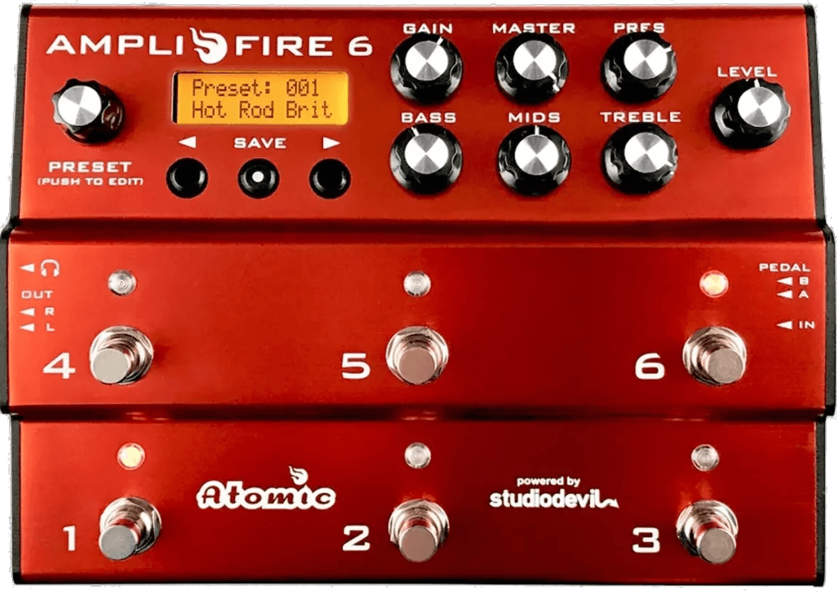 The Atomic AmpliFIRE6 is a multi-effects modeling pedal designed for amp and effects processing. This device offers six footswitches for controlling amp modeling, effects, and user presets in a compact enclosure. The AmpliFIRE6 features both mono and stereo outputs, MIDI connectivity, and an expression pedal input for real-time parameter control. It supports cabinet simulation, user IR loading, and offers USB connectivity for preset management and firmware updates. The interface delivers flexible routing and bypass options for integration with pedalboards or standalone use.