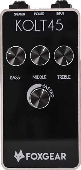 The Foxgear Kolt 45 is a compact 45-watt amplifier pedal designed to provide RMS output at 4 Ohms in a stompbox format. This portable guitar amp pedal features a three-band EQ with dedicated Treble, Middle, and Bass controls, alongside a master volume knob. Designed for direct connection, it offers an instrument input and a cabinet output, delivering amplifier functionality in a pedalboard-friendly enclosure. The Foxgear Kolt 45 amplifier pedal is engineered for use in practice, rehearsal, or live situations, bringing powerful tone shaping and amplification directly to the pedalboard.