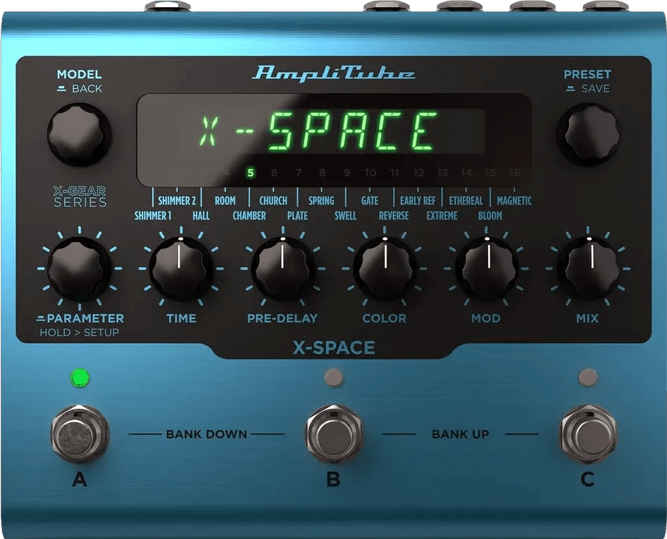 The IK Multimedia AmpliTube X-SPACE is a stereo reverb effects pedal offering 16 reverb algorithms built using the AmpliTube sound engine. This true stereo reverb pedal features onboard preset storage and comes with a software counterpart (X-GEAR) that integrates with AmpliTube 5 SE for detailed editing and preset management. Users can record with the same reverb algorithms in their DAW and then transfer presets directly to the physical pedal. Designed with true bypass switching and extensive connectivity, the AmpliTube X-SPACE reverb pedal is adaptable for multiple applications.