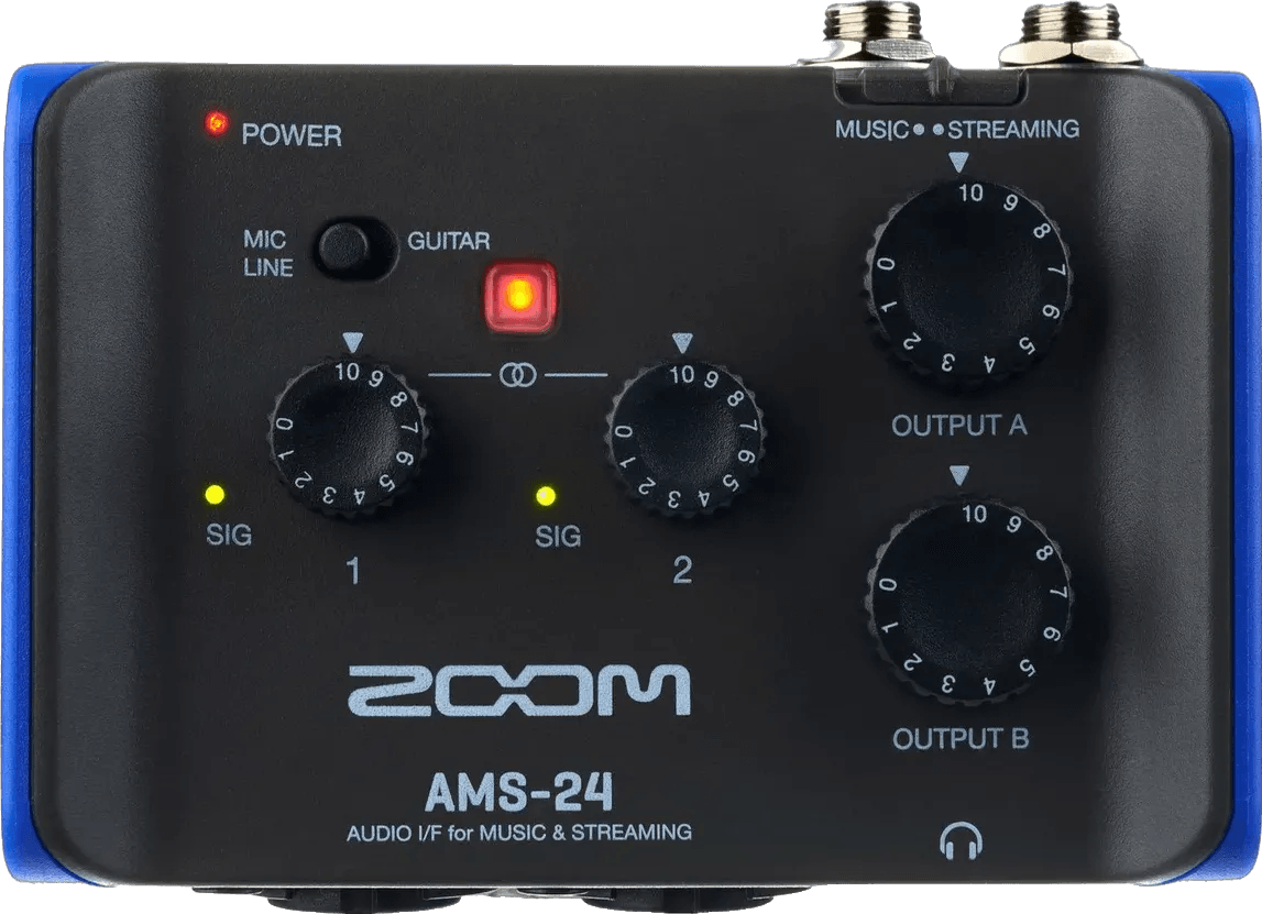 The ZOOM AMS24 is a compact USB audio interface designed for multi-platform recording and streaming applications. Featuring two combo XLR/TRS inputs with 48V phantom power, this interface supports microphones, line-level sources, and instruments. The AMS24 provides two TRS outputs and a dedicated headphone output with independent volume controls. A hardware switch enables fast toggling between Music and Streaming modes for seamless workflow changes. USB bus power ensures easy integration with devices, while loopback function is included for real-time mixing of input signals and playback audio. Compatible with Mac, Windows, iOS, and Android platforms, the ZOOM AMS24 audio interface offers flexible connectivity for a broad range of setups.