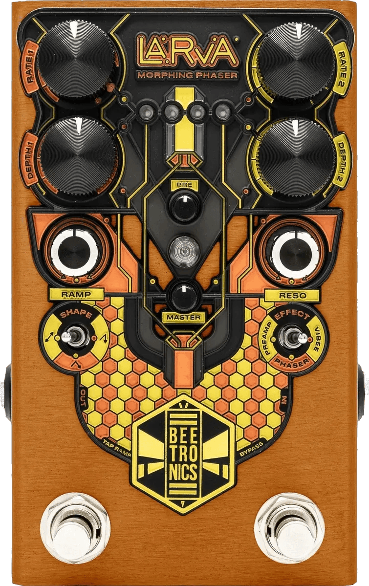 The Beetronics Larva Morphing Phaser is an analog phaser effects pedal featuring 6-stage circuitry with morphing capabilities and an integrated preamp. This Beetronics effects pedal allows toggling between two independent phaser settings or smoothly morphing from one setting to another for varied modulation textures. The onboard preamp circuit, inspired by Moogerfooger, is usable independently and is designed to enrich phase and vibe tones with adjustable gain. The Larva Morphing Phaser also includes unique vibee functionality for additional tonal options.