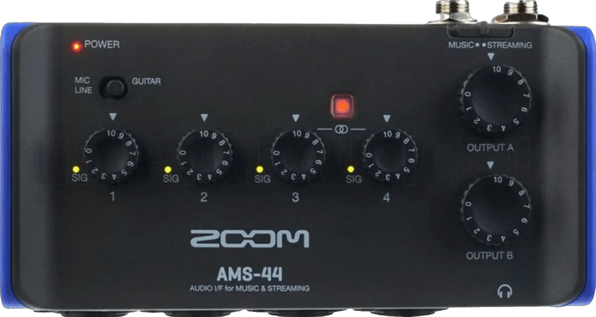The ZOOM AMS-44 is a 4-in/4-out USB audio interface designed for recording and streaming a variety of audio sources. This interface provides four XLR/TRS combo inputs equipped with high-performance, low-noise preamps, allowing flexible connection of microphones and line-level instruments. For output options, the AMS-44 offers two independent headphone outputs and two TRS main outputs for external monitor speakers. The USB connectivity supports use with computers and compatible mobile devices, enabling direct digital audio integration with DAWs or streaming platforms.