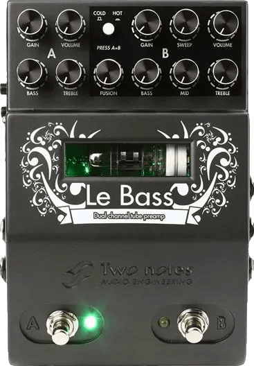 The Two Notes Le Bass Dual-channel tube preamp pedal is a tube-driven preamp designed for bass instruments, offering two fully independent channels with dedicated controls. Operating at 200 volts for high headroom, it delivers a wide range of clean and overdriven bass tones. The pedal includes a speaker simulation switch, enabling direct output with cab emulation. Two selectable fusion modes allow for additional tonal blending between the channels. True bypass switching ensures your signal remains uncolored when the pedal is disengaged.