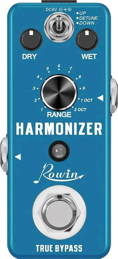 The Rowin LEF-3807 Harmonizer is a compact pitch-shifting effects pedal designed for real-time harmonization and modulation. This pitch shifter pedal features three selectable modes: Harmony, Pitch Shift, and Detune. The Harmony mode shifts the pitch and blends it with the dry signal, producing layered harmonies. Pitch Shift mode offers accurate polyphonic pitch shifting, allowing for precise interval changes. The Detune mode subtly shifts pitch and mixes the results with the original signal, creating a chorus-style modulation effect. Core functions are accessed via a single control knob, and true bypass switching ensures signal integrity when the pedal is disengaged.