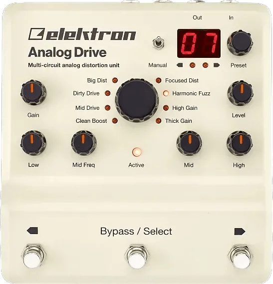 The Elektron Analog Drive is a multi-mode analog distortion effects pedal featuring eight selectable drive circuits. Designed to provide a wide range of distortion and overdrive sounds in a single unit, this effects stompbox includes adjustable controls for Level, Low, High, and the Blend of clean and processed signal. Dedicated gain and tone shaping options allow users to tailor their sound across multiple distortion types, from subtle overdrive to heavy, fuzz-style saturation. The Analog Drive is compatible with a broad range of instruments and signal sources.