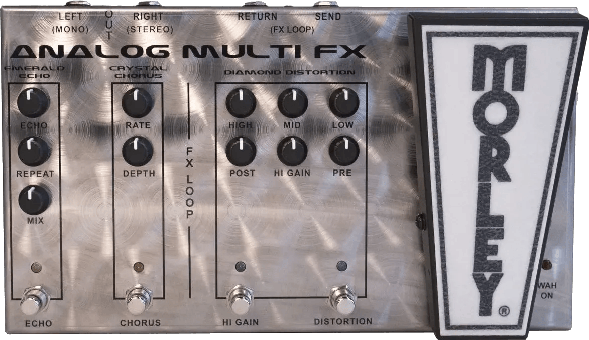 - Analog multi effects pedal with Morley switchless optical wah, distortion, stereo chorus, and echo