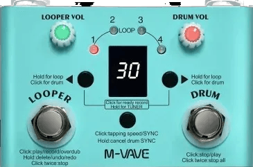 The M Vave Lost Tempo V2 is a multi-function looper pedal that combines a high-precision tuner, a four-track looper offering up to eleven minutes of recording time, and a programmable drum machine with thirty adjustable patterns. This effects pedal streamlines practice, songwriting, and live performance by integrating essential tools in a compact design. The single footswitch provides control over recording, playback, overdub, undo/redo, and track deletion, enabling hands-free operation. Drum machine patterns are editable and MIDI-sync to tempo, supporting custom groove creation. USB-C connectivity allows for WAV file import/export and firmware updates. The housing is built from durable zinc alloy, offering reliability in a small pedalboard footprint.