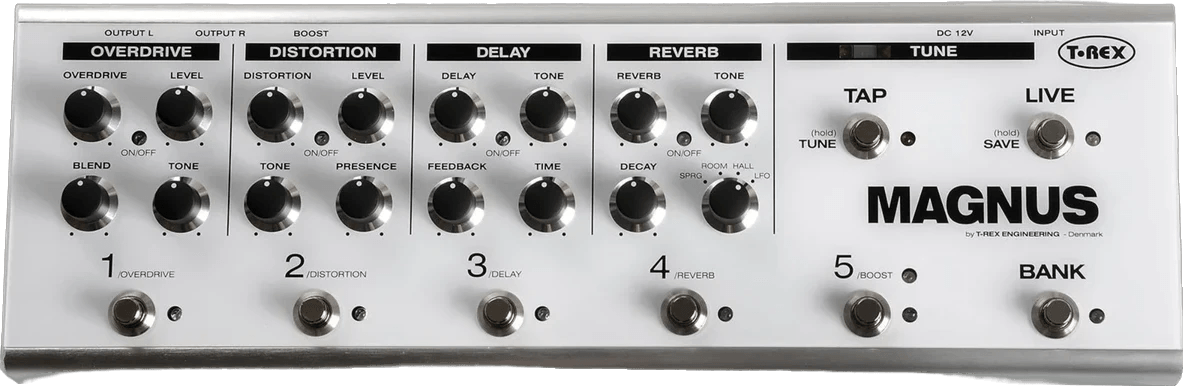 The T-Rex Magnus is a multi-effects pedal that combines overdrive, distortion, delay, reverb, and boost effects, each modeled after classic T-Rex effects pedals. This multi-effects unit allows users to operate under two modes: "Live" mode for direct control over each effect and "Preset" mode, which enables programming and recalling up to 10 effect combinations instantly. The Magnus is suitable for both stage and studio environments, offering streamlined control for complex signal chains.